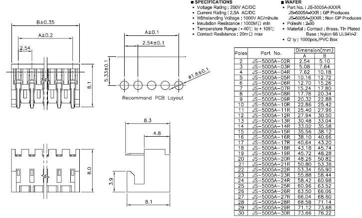 | Poles: 2-30 Material: Contact : Brass,Tin plated Base: Nylon 66 UL 94V-2 Q'ty: 1,000 pcs/Bag |