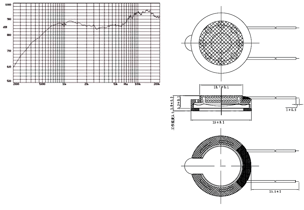 - SPL@0.8,1.0,1.2,1.5KHz (0.1W/0.1m): 88±3dB