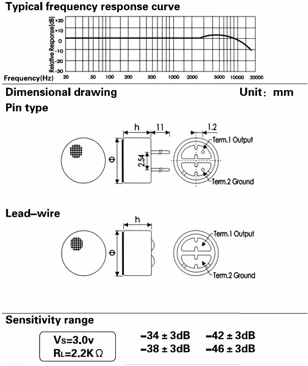 - Sensitivity: See above(0dB = 1v / Pa, 1kHz)