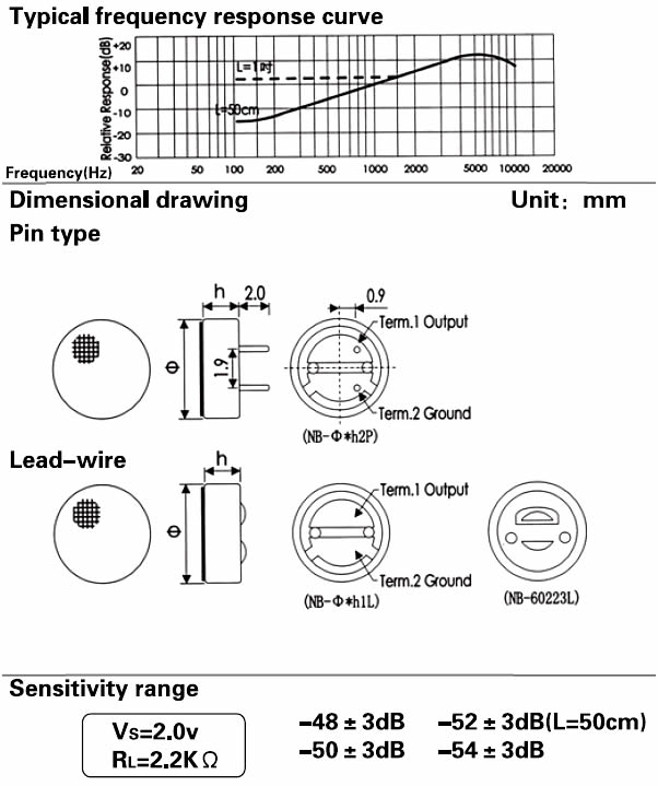 - Sensitivity: See above(0dB = 1v / Pa, 1kHz)