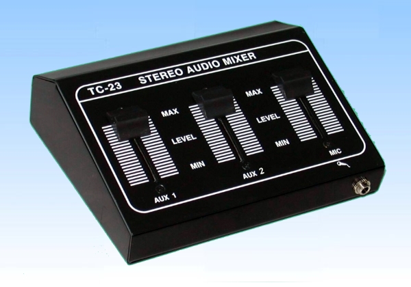 stereo audio mixer designed to mix 2 audio inputs from VCR, Camcorder, Music